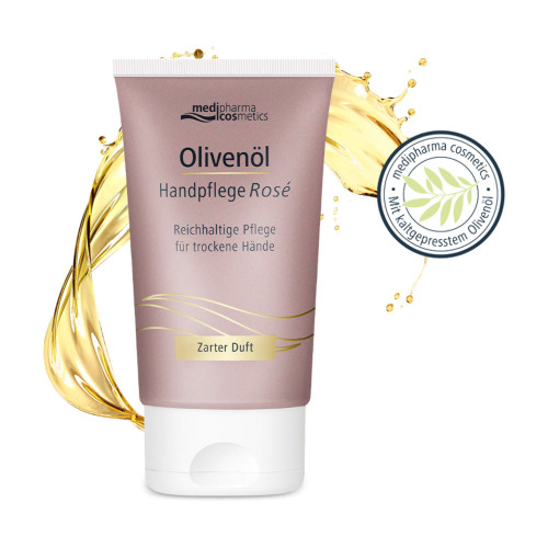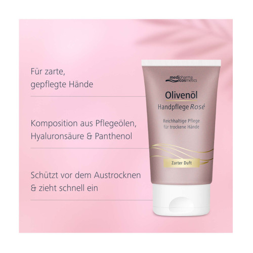 Die Olivenöl Handpflege Rosé von medipharma cosmetics enthält kaltgepresstes Olivenöl, das die Haut vor dem Austrocknen schützt und sie geschmeidig hält. Mit einer sorgfältig abgestimmten Komposition aus Pflegeölen, Hyaluronsäure und Panthenol pflegt die Handcreme die Hände seidig-zart. Das enthaltene Rosenwasser der Damascena-Rose hinterlässt einen angenehm zarten Duft nach Rose. Die Olivenöl Handpflege Rosé spendet trockener Haut intensive Feuchtigkeit, zieht schnell ein und fettet nicht.