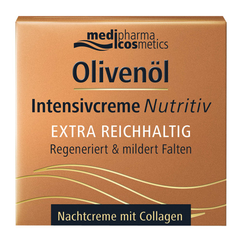 Die Olivenöl Intensivcreme Nutritiv Nachtpflege mit Olivenöl, Olivenbutter, Vitamin A und Collagen regeneriert die Haut während der nächtlichen Aufbauphase und mildert Falten. Eine extra reichhaltige Pflegeformel für ein Mehr an Elastizität und zur Vorbeugung von Faltenbildung.