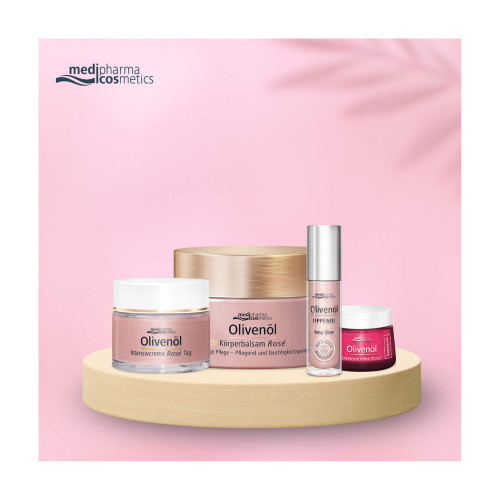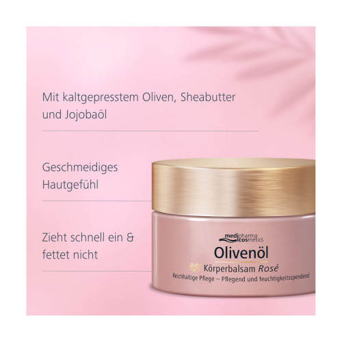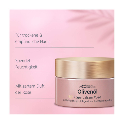 Der Olivenöl Körperbalsam Rosé von medipharma cosmetics umhüllt die Haut mit sanfter Pflege und zartem Rosenduft. Trockene und empfindliche Haut verliert schnell an Feuchtigkeit und neigt dadurch zu Spannungsgefühlen – eine reichhaltige Pflege mit dem Olivenöl Körperbalsam Rosé hilft, sie wieder geschmeidig und angenehm entspannt werden zu lassen. Ganz leichte schimmer-Partikel verleihen der Haut einen strahlenden Teint.