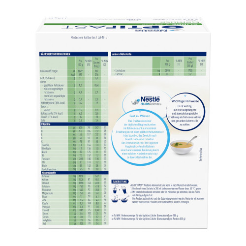 Milcheiweiß, Magermilchpulver, pflanzliche Öle, enthalten Milcheiweiß (Raps, Sonnenblume), getrocknetes Gemüse (7,2 %) (Kartoffel, Tomate, Lauch, Karotte, Zwiebel), Ballaststoffe (Gummi arabicum, Fructo-Oligosaccaride, Inulin), Mineralstoffe (Kaliumcitrat, Magnesiumcitrat, Kaliumphosphat, Natriumchlorid, Calciumcarbonat, Eisenpyrophosphat, Zinksulfat, Kupfergluconat, Mangansulfat, Natriumfluorid, Natriumselenat, Chromchlorid, Natriummolybdat, Kaliumiodid), Aroma, Maltodextrin, Fischöl (enthält Sojalecithin, Milcheiweiß), getrocknete Petersilie, Vitamine (Niacin, E, Pantothensäure, C, B6, Thiamin, Riboflavin, A, Folsäure, K, Biotin, D, B12), Farbstoff (Kurkumin), Geschmacksverstärker (Mononatriumglutamat), Paprika.
