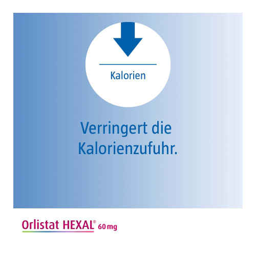 Orlistat Hexal 60 mg Hartkapseln. Wirkstoff: Orlistat. Anwendungsgebiete: Dient der Gewichtsreduktion und wird bei übergewichtigen Erwachsenen ab 18 Jahren mit einem Body-Mass-Index (BMI) von 28 oder darüber angewendet. Sollte in Verbindung mit einer fett- und kalorienreduzierten Ernährung angewendet werden. Warnhinweis: Enthält Natrium.