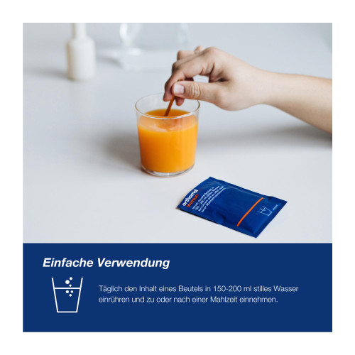 Täglich den Inhalt eines Beutels in 150-200 ml stilles Wasser einrühren und zu oder nach einer Mahlzeit einnehmen.