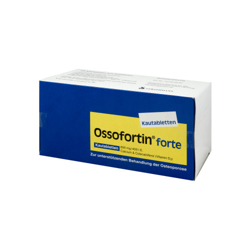 Ossofortin forte 600 mg / 400 I.E. Kautabletten. Anwendungsgebiete: wird zur unterstützenden Behandlung der Osteoporose angewendet.