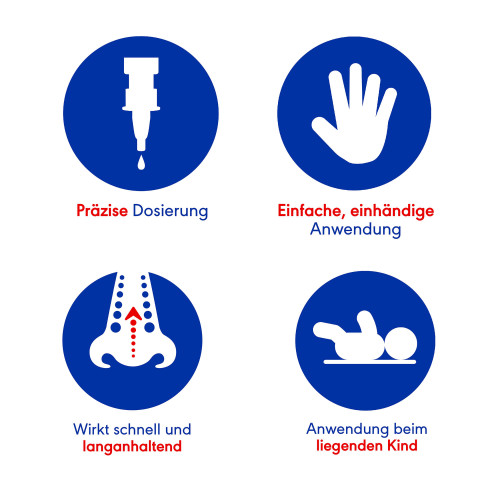 | Säuglinge und Kleinkinder unter 2 Jahren | 1 Tropfen pro Nasenloch | 2-3 mal täglich | verteilt über den Tag, im Abstand von 8-10 Stunden |