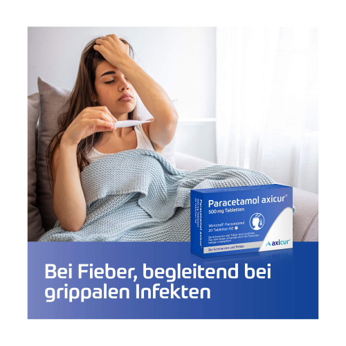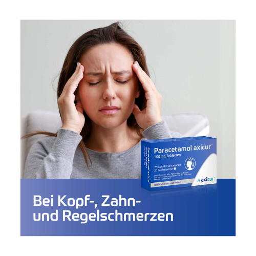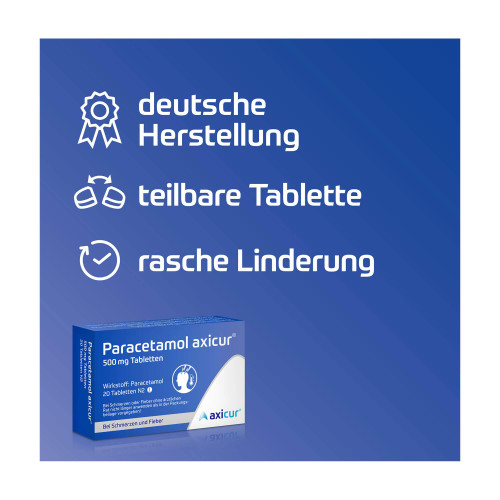 Paracetamol axicur 500 mg Tabletten. Anwendungsgebiete: Schmerzstillendes, fiebersenkendes Arzneimittel zur symptomatischen Behandlung von leichten bis mäßig starken Schmerzen wie Kopfschmerzen, Zahnschmerzen, Regelschmerzen und/oder von Fieber.