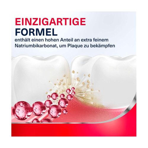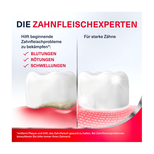 Die Zahnpasta enthält einen hohen Anteil an Natriumbicarbonat, das dazu beiträgt, Plaque 4x effektiver als eine herkömmliche Zahnpasta zu entfernen* und ermöglicht die Entfernung von Plaque auch an schwer zugänglichen Stellen. Wenn Zahnfleischprobleme nicht behandelt werden, kann es zu Mundgeruch, Rötungen und Schwellungen des Zahnfleischs, Zahnfleischrückgang und letztlich zu Zahnverlust kommen.