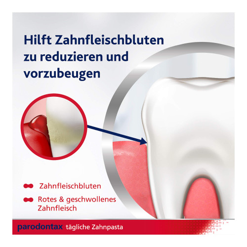 Gesundes Zahnfleisch umschließt die Zähne eng. Wenn sich Plaque-Bakterien entlang des Zahnfleischrandes ansammeln, kann dies zu Reizungen führen, wodurch das Zahnfleisch nicht mehr so eng am Zahn anliegen kann. Dies kann zu blutendem und geschwollenem Zahnfleisch führen. parodontax Zahnfleisch Active Repair* bekämpft gezielt die Ursache von Zahnfleischproblemen. Sie wurde speziell entwickelt um das Zahnfleischbluten durch die gezielte Entfernung von Plaque zu reduzieren und vorzubeugen. So unterstützt Zahnfleisch Active Repair* das Zahnfleisch bei der Regeneration. Bei zweimal täglichem Zähneputzen hilft die Zahnpasta nachweislich, Zahnfleischbluten zu reduzieren und vorzubeugen.