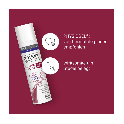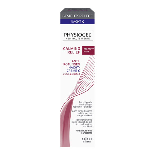 Die PHYSIOGEL® Calming Relief Anti-Rötungen Nachtcreme wurde speziell für die nächtliche Pflege empfindlicher Haut entwickelt, die zu Couperose, Rosacea und Rötungen neigt. Sie reduziert Rötungen sichtbar über Nacht und beruhigt die Haut sofort sowie langanhaltend. Gleichzeitig stärkt sie die Hautbarriere und unterstützt deren natürliche Regeneration. So wird empfindliche, zu Rötungen neigende Haut optimal während der Nacht gepflegt.