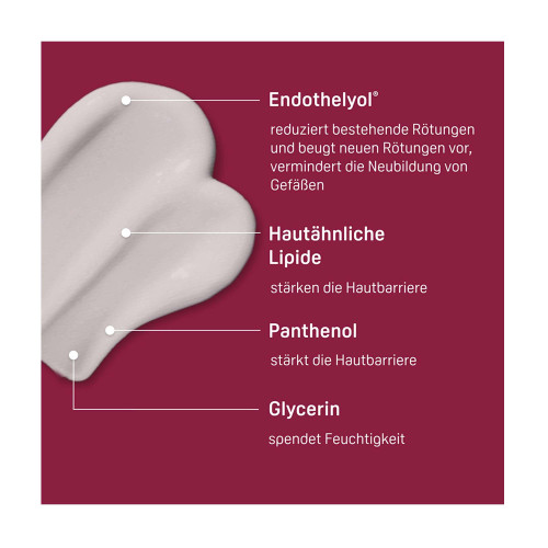 Der zentrale Wirkstoffkomplex Endothelyol® wirkt gezielt gegen Rötungen, indem er die Gefäßneubildung hemmt und die Sichtbarkeit feiner Äderchen vermindert. Außerdem werden Entzündungsbotenstoffe reduziert – der Wirkkomplex greift damit also an Entstehungsmechanismen an.