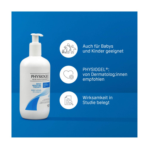 Die PHYSIOGEL® Daily Moisture Therapy Bodylotion ist die tägliche Feuchtigkeitspflege für den ganzen Körper. Sie ist bereits für Babys und Kinder geeignet. Ein Wirkkomplex aus hautverwandten Lipiden (Fetten) schützt die Haut vor Trockenheit und hinterlässt ein weiches und geschmeidiges Hautgefühl.