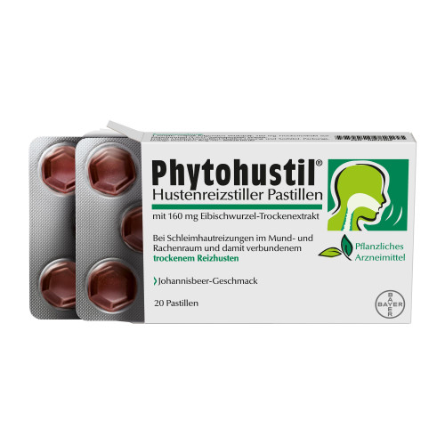 Phytohustil Hustenreizstiller Pastillen. Wirkstoff: Eibischwurzel-Trockenextrakt. Anwendungsgebiete: Zur Linderung von Schleimhautreizungen im Mund- und Rachenraum und damit verbundenem trockenen Reizhusten. Ausschließlich auf Grund langjähriger Anwendung für das Anwendungsgebiet registriert. Bei fortdauernden Krankheitssymptomen oder beim Auftreten anderer als der in der Packungsbeilage erwähnten Nebenwirkungen sollte der Anwender einen Arzt oder eine andere in einem Heilberuf tätige qualifizierte Person konsultieren.