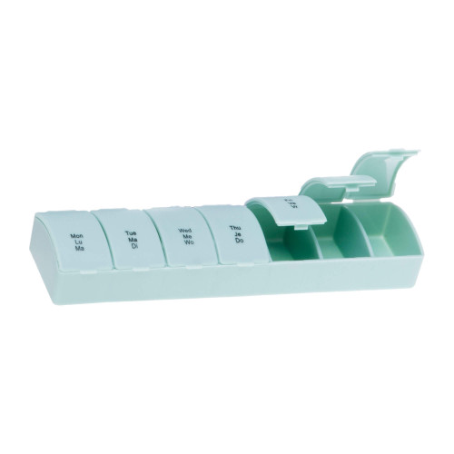 Die Pillendose mit 7 Fächern ermöglicht eine präzise Organisation und Dosierung Ihrer Medikamente für die Woche. Jedes Fach ist mit einem Wochentag beschriftet und erleichtert somit die tägliche Einnahmeroutine. Die Fächer sind geräumig genug, um mehrere Tabletten oder auch größere Medikamente sicher aufzubewahren. Dank des einfachen Öffnungsmechanismus sind Ihre Medikamente leicht zugänglich, während sie gleichzeitig sicher und geschützt aufbewahrt werden.