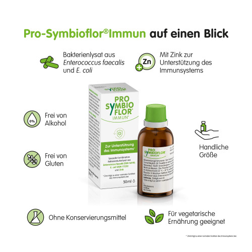 Das Nahrungsergänzungsmittel Pro-Symbioflor® Immun* besteht aus einem Bakterienlysat, hergestellt aus Enterococcus faecalis DSM 16440- und E.coli DSM 17252-Bakterien, und Zink zur Unterstützung des Immunsystems*.