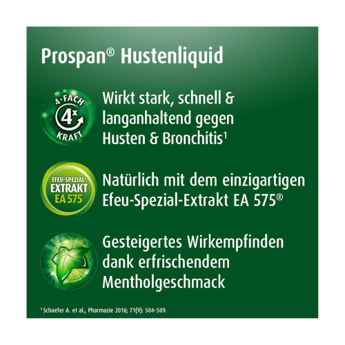 Prospan® Hustenliquid, Flüssigkeit zum Einnehmen. Wirkstoff: Efeublätter-Trockenextrakt. Anwendungsgebiete: Zur Besserung der Beschwerden bei chronisch-entzündlichen Bronchialerkrankungen; akute Entzündung der Atemwege mit der Begleiterscheinung Husten. Hinweis: Bei länger anhaltenden Beschwerden oder bei Auftreten von Atemnot, Fie-ber wie auch bei eitrigem oder blutigem Auswurf, sollte umgehend der Arzt aufgesucht werden.Warnhinweis: Enthält Sorbitol.
