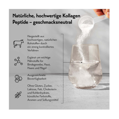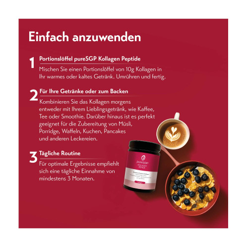Das Produkt ist ein hellfarbenes, agglomeriertes Pulver mit neutralem Geschmack und Geruch. Es zeichnet sich durch hervorragende Löslichkeitseigenschaften aus und eignet sich somit ideal für eine Vielzahl von Anwendungen im Alltag, sei es im Kaffee, Shake oder Smoothie. Um die Kollagenbildung im Körper bestens zu unterstützen, enthält pureSGP® Kollagen Peptide außerdem Vitamin C, sowie weitere wichtige Nährstoffe*** für Haut, Haare, Nägel und Bindegewebe.