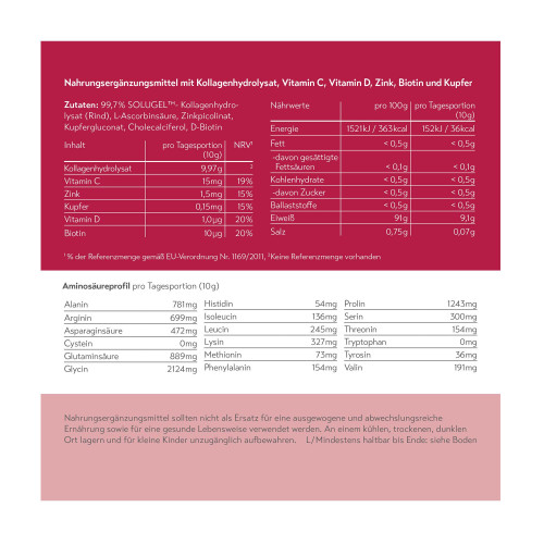 99,7% SOLUGEL™- Kollagenhydrolysat (Rind), L-Ascorbinsäure, Zinkpicolinat, Kupfergluconat, Cholecalciferol, D-Biotin.