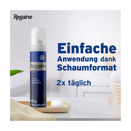 Regaine® Männer. Wirkstoff: Minoxidil. Anwendungsgebiete: Regaine Männer Schaum stabilisiert den Verlauf des anlagebedingten Haarverlustes (androgenetische Alopezie) im Tonsurbereich der Kopfhaut bei Männern im Alter von 21-49 Jahren. Die Behandlung kann so dem Fortschreiten des anlagebedingten Haarverlustes entgegenwirken. Beginn und Ausmaß können individuell unterschiedlich sein u. sind nicht vorhersagbar.