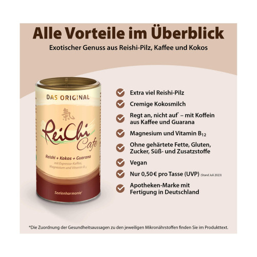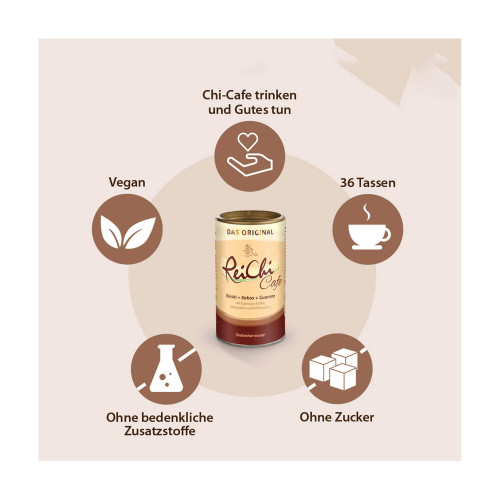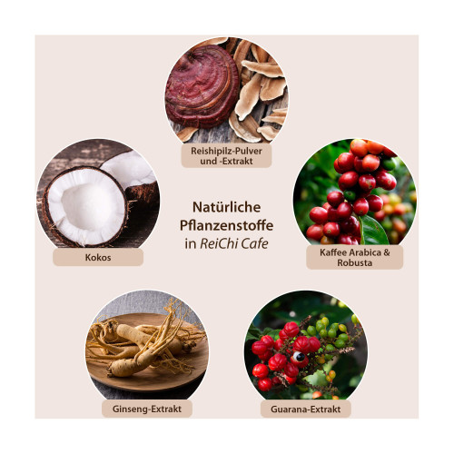 Das Besondere an ReiChi Cafe ist seine einzigartige Komposition aus dem fein-herben Aroma des Reishi-Pilzes, Ginseng, Guarana und Espresso-Kaffee kombiniert mit der mild-cremigen Note von Kokosmilch. Feinste Espresso-Bohnen, sorgfältig ausgewählt und schonend geröstet, verfeinern sein unvergleichliches Aroma.