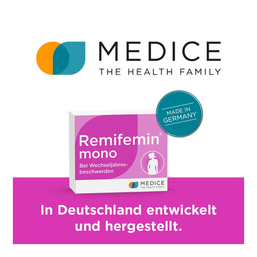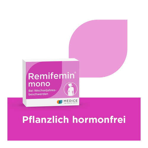 Remifemin mono Tabletten. Wirkstoff: Cimicifugawurzelstock-Trockenextrakt. Anwendungsgebiete: Wechseljahresbeschwerden wie z. B. Hitzewallungen und übermäßiges Schwitzen. Warnhinweis: Enthält Lactose.