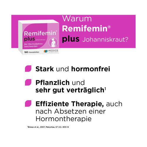 Remifemin® plus Johanniskraut. Anwendungsgebiete: Zur Linderung von Hitzewallungen und übermäßigem Schwitzen in den Wechseljahren, wenn diese Symptome mit zusätzlichen psychischen Wechseljahresbeschwerden wie z.B. Verstimmungszuständen, Nervosität und Reizbarkeit einhergehen. Warnhinweis: Enthält pro Filmtablette 163 mg Lactose (Milchzucker) und (3-sn-Phosphatidyl)cholin (Lecithin aus der Sojabohne).
