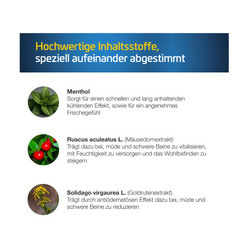 Es trägt zu einem angenehmen, entspannenden Körpergefühl bei – ideal zur Pflege nervlich beanspruchter Körperbereiche und zur Unterstützung bei müden oder schweren Beinen.