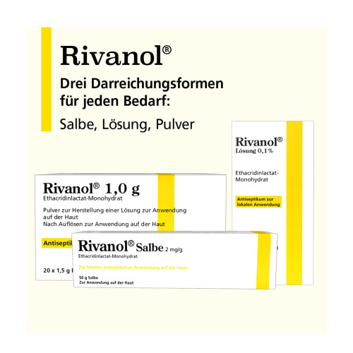 Rivanol Salbe enthält den Wirkstoff Ethacridinlactat. Es ist ein Arzneimittel aus der Stoffgruppe der Acridinderivate mit einer breiten antibakteriellen Wirkung gegen Wundinfektionen (Antiseptikum). Es hemmt bei lokaler Anwendung den Aufbau der Bakterienwand und führt dadurch zum schnellen Absterben einer Vielzahl von Krankheitserregern.