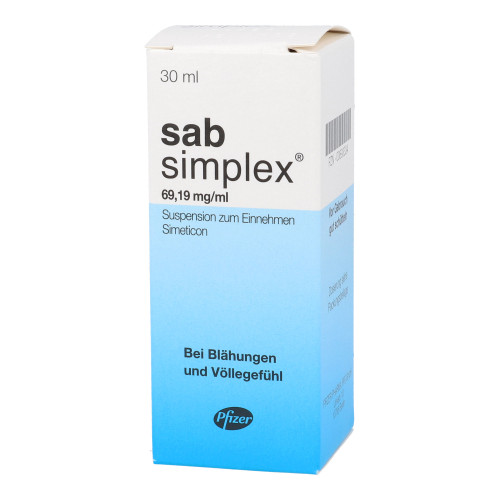 sab simplex® 69,19mg/ml. Wirkstoff: Simeticon. Anwendungsgebiete: zur symptomatischen Behandlung gasbedingter Magen-Darm-Beschwerden, z. B. Blähungen (Meteorismus), Völlegefühl; zur Vorbereitung von Untersuchungen im Bauchbereich, wie z. B. Röntgen und Sonographie (Ultraschalluntersuchung) und zur Vorbereitung von Gastroduodenoskopien (Magen-Darm-Spiegelungen); bei verstärkter Gasbildung nach Operationen; bei Spülmittelvergiftungen.