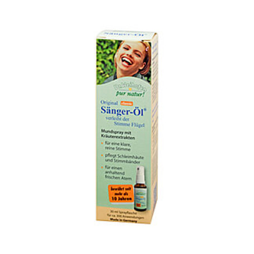 Die hochwertige Zubereitung Sänger-Öl pflegt die Schleimhäute bei stark beanspruchten Stimmbändern, Belastungen durch trockene Heizungsluft und Tabakrauch. Es ist somit ideal für Sänger und alle, die viel sprechen.