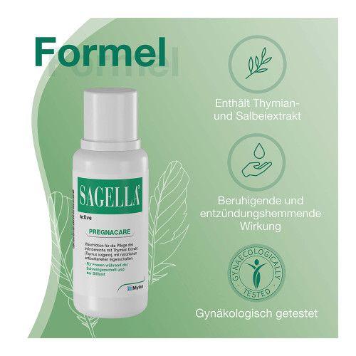 Durch die antibakterielle, antimykotische und desodorierende Wirkung des Salbei- und Thymianextraktes dient Sagella Active -Pregnacare der natürlichen Infektionsprophylaxe. Der Säureschutzmantel wird durch Milchsäure unterstützt und ein natürliches Gleichgewicht im Intimbereich gefördert. Die Formel von Sagella Active - Pregnacare ist dabei sehr schonend und auf die besonderen Bedürfnisse schwangerer Frauen angepasst.