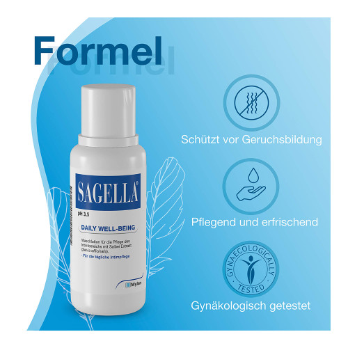 Herkömmliche Duschgels können bei der täglichen Pflege das empfindliche Gleichgewicht des Intimbereichs stören, da sie nicht an den pH-Wert der Schleimhaut angepasst sind. Sagella® pH 3,5 ist angepasst an den physiologischen pH-Wert und pflegt an jedem Tag von der ersten bis zur letzten Periode mit der beruhigenden und erfrischenden Kraft des Salbeis sowie mit Milchsäure zur Unterstützung des natürlichen Schutzschildes im Intimbereich.
