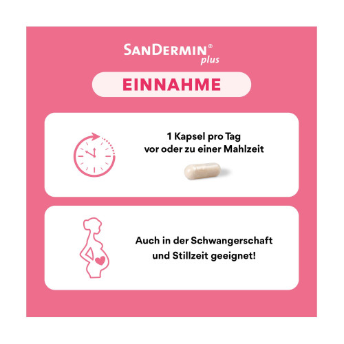 Die Kapsel kann auch geöffnet und der Inhalt mit nicht heißen Speisen oder Getränken verzehrt werden. Die Einnahme von SanDermin®plus ist über einen längeren Zeitraum (mehrere Monate) möglich und empfohlen.