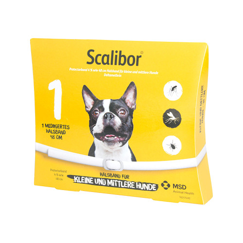 Scalibor® Protectorband. Anwendungsgebiete: Zur Verhinderung des Befalls mit Zecken (Ixodes ricinus, Rhipicephalus sanguineus) für 5 bis 6 Monate. Zur Verhinderung des Blutsaugens durch Schmetterlingsmücken (Phlebotomus perniciosus) für die Dauer von 5 bis 6 Monaten. Zur Verhinderung von Stichen durch adulte Mücken der Spezies Culex pipiens pipiens über einen Zeitraum von 6 Monaten.