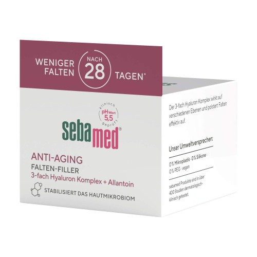 sebamed Anti-Aging Falten-Filler wirkt aufpolsternd mit 3-fach Hyaluron Complex. sebamed Anti-Aging Falten-Filler ist besonders auf die Bedürfnisse zu Trockenheit neigender Haut mit bereits ausgeprägten Falten abgestimmt. Der Falten-Filler wirkt auf verschiedenen Ebenen und polstert Falten effektiv auf: