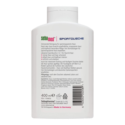 sebamed Sportdusche 2 in 1 für Haut & Haar reinigt Haut und Haar schonend, pflegt Haar und Kopfhaut intensiv und erfrischt und vitalisiert. Auch bei intensivem Training und häufigem Duschen bleibt die Haut spürbar gepflegt. Der hauteigene pH-Wert 5,5 fördert optimal die Funktion des natürlichen Hautschutzmantels – Haut und Kopfhaut bleiben gesund. Von Dermatologen und deutschen Spitzensportlern empfohlen.