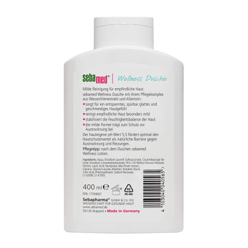 Milde Reinigung für empfindliche Haut sebamed Wellness Dusche mit ihrem Pflegekomplex aus Wasserlilienextrakt und Allantoin sorgt für ein entspanntes, spürbar glattes und geschmeidiges Hautgefühl. Sie reinigt empfindliche Haut besonders mild und stabilisiert die Feuchtigkeitsbalance der Haut. Die milde Formel trägt zum Schutz vor Austrocknung bei. Der hauteigene pH-Wert 5,5 fördert optimal den Hautschutzmantel als natürliche Barriere gegen Austrocknung und Reizungen.