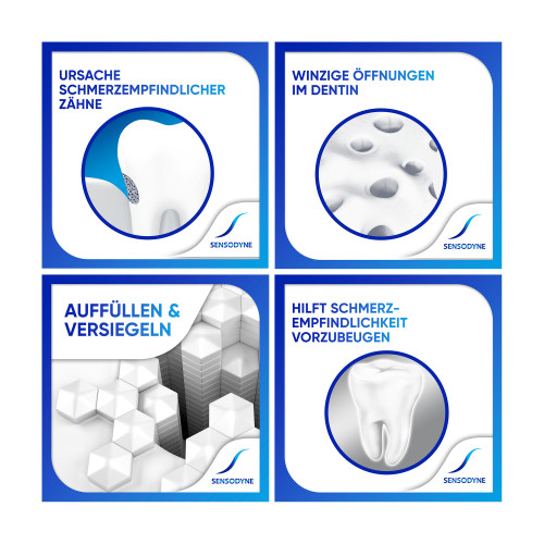 Beim täglichen Zähneputzen mit Sensodyne Repair* Protect werden freiliegende Öffnungen im Dentin aufgefüllt und eine reparierende Schutzschicht darüber gebildet. So hilft sie klinisch bestätigt, Schmerzempfindlichkeit zu reduzieren.