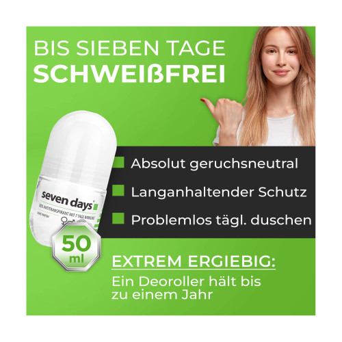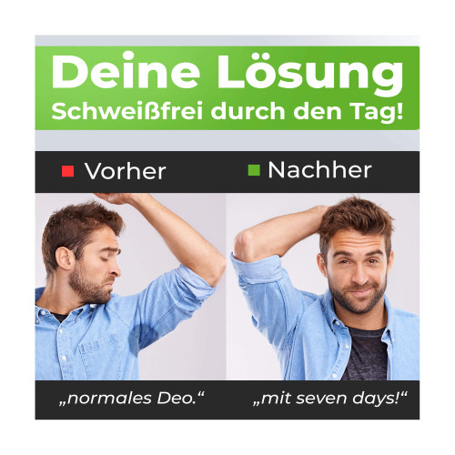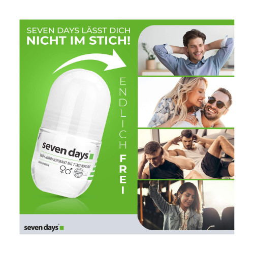 Die Rezeptur ist so angelegt, dass die Mehrheit der Verwender tatsächlich nur einmal in der Woche zum Antischwitzmittel greifen muss. Die Langzeitwirkung setzt in der Regel bereits nach der ersten Anwendung ein. Verwende seven days® erst wieder, wenn du wieder mehr schwitzt.