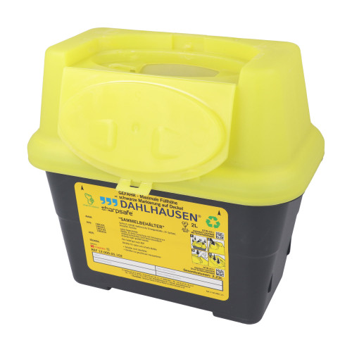 Sharpsafe®-Behälter sind mit einem Tragegriff ausgestattet und einhändig verwendbar. Der maximale Füllstand ist deutlich sichtbar durch eine schwarze Linie auf dem Deckel gekennzeichnet.