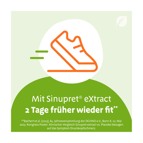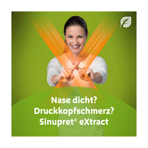 Sinupret extract Überzogene Tabletten. Anwendungsgebiet: Bei akuten, unkomplizierten Entzündungen der Nasennebenhöhlen (akute, unkomplizierte Rhinosinusitis) mit Symptomen wie Schnupfen, verstopfte Nase, Kopf- und Gesichtsschmerz bzw. -druck. Sinupret extract wird angewendet bei Erwachsenen und Jugendlichen ab 12 Jahren. Warnhinweis: Enthält Glucose und Sucrose.