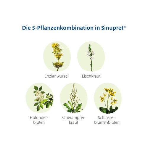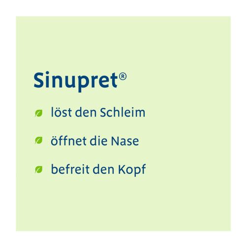 Sinupret. Anwendungsgebiete: Bei akuten und chronischen Entzündungen der Nasennebenhöhlen. Warnhinweise: Enthält Glucose, Lactose, Saccharose und Sorbitol.