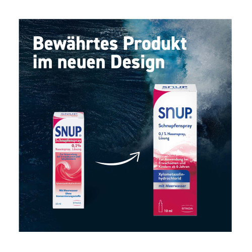 Snup Schnupfenspray 0,1 % Nasenspray, Lösung. Wirkstoff: Xylometazolinhydrochlorid. Anwendungsgebiete: Zur Anwendung bei Erwachsenen und Kindern ab 6 Jahren. Zur Abschwellung der Nasenschleimhaut bei Schnupfen, auftretendem Fließschnupfen (Rhinitis vasomotorica), allergischem Schnupfen (Rhinitis allergica); zur Erleichterung des Sekretabflusses bei Entzündung der Nasennebenhöhlen sowie bei Katarrh des Tubenmittelohrs in Verbindung mit Schnupfen.