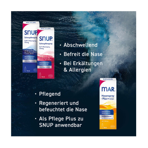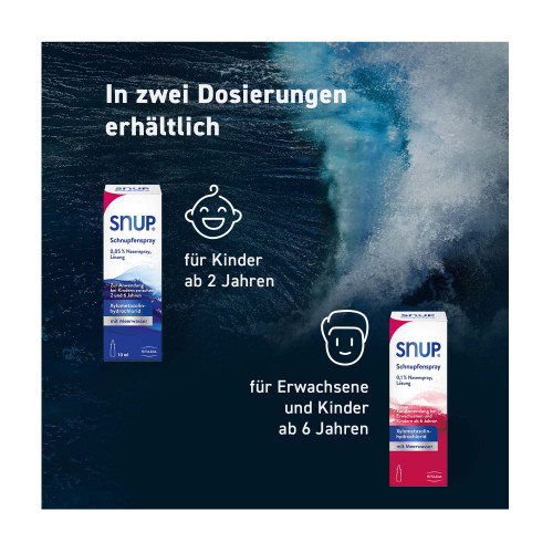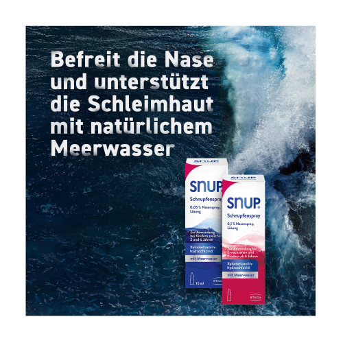 Snup Schnupfenspray 0,1 % Nasenspray, Lösung. Wirkstoff: Xylometazolinhydrochlorid. Anwendungsgebiete: Zur Anwendung bei Erwachsenen und Kindern ab 6 Jahren. Zur Abschwellung der Nasenschleimhaut bei Schnupfen, auftretendem Fließschnupfen (Rhinitis vasomotorica), allergischem Schnupfen (Rhinitis allergica); zur Erleichterung des Sekretabflusses bei Entzündung der Nasennebenhöhlen sowie bei Katarrh des Tubenmittelohrs in Verbindung mit Schnupfen.