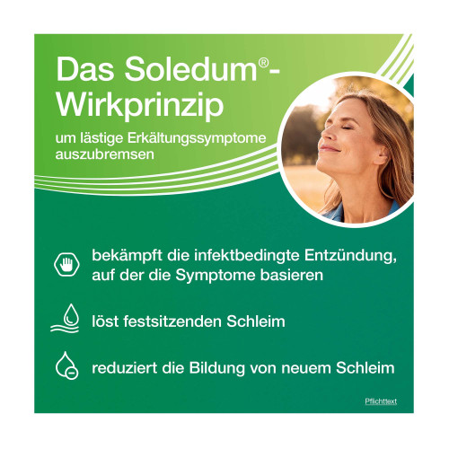 - Bei Erkrankungen, die mit einer ausgeprägten Überempfindlichkeit der Atemwege einhergehen, sollte Soledum Balsam nur unter ärztlicher Kontrolle des Gesamttherapieregimes der Erkrankung angewendet werden.