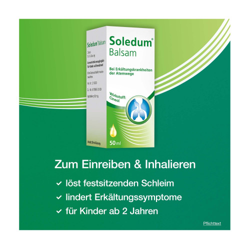 Soledum Balsam. Wirkstoff: Cineol. Anwendungsgebiete: Zur Verbesserung des Befindens bei Erkältungskrankheiten der oberen und unteren Atemwege (wie unkomplizierter Schnupfen, Heiserkeit, unkomplizierter Bronchialkatarrh, unkomplizierter Nasennebenhöhlenkatarrh). Soledum® Balsam ist ausschließlich für die äußere Anwendung (Inhalation, Einreibung) vorgesehen. Nicht zum Einnehmen.