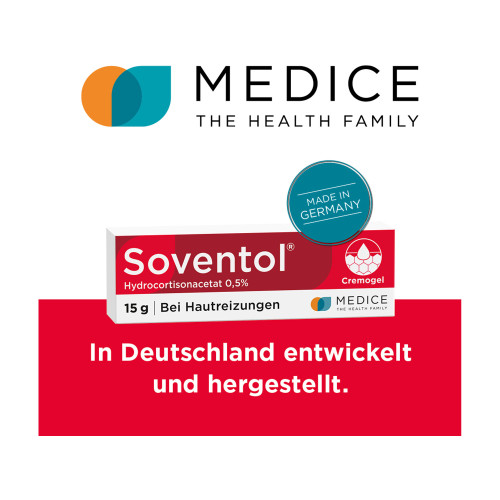 Soventol® Hydrocortisonacetat 0,5%. Wirkstoff: Hydrocortisonacetat (Ph. Eur.). Anwendungsgebiete: Bei mäßig ausgeprägten geröteten, entzündlichen oder allergischen Hauterkrankungen, bei denen schwach wirksame, niedrig konzentrierte Corticosteroide angezeigt sind. Warnhinweis: Keine Anwendung bei Kindern unter 6 Jahren ohne ärztliche Verordnung.