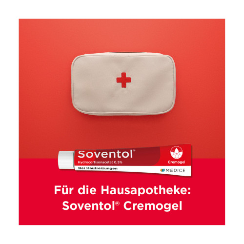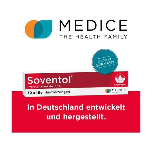 Soventol® Hydrocortisonacetat 0,5%. Wirkstoff: Hydrocortisonacetat (Ph. Eur.). Anwendungsgebiete: Bei mäßig ausgeprägten geröteten, entzündlichen oder allergischen Hauterkrankungen, bei denen schwach wirksame, niedrig konzentrierte Corticosteroide angezeigt sind. Warnhinweis: Keine Anwendung bei Kindern unter 6 Jahren ohne ärztliche Verordnung.
