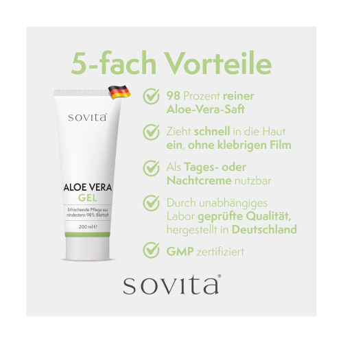 Das sovita Aloe Vera Gel ist ein hochwertiges Pflegeprodukt für trockene und strapazierte Haut. Mit einem besonders hohen Anteil an reinem Aloe Vera Blattsaft von 98 % ist es feuchtigkeitsspendend und beruhigend. Das Gel erhöht die Spannkraft der Haut und garantiert ein vitalisierendes Frische-Erlebnis.