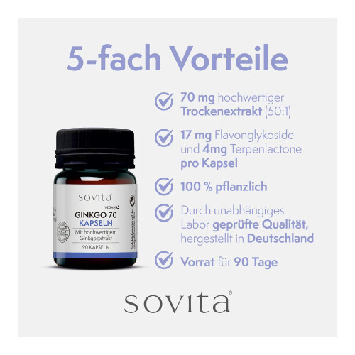 Die sovita Ginkgo 70 Kapseln enthalten einen hochwertigen Ginkgo biloba Extrakt mit einem Gehalt von 70 mg Ginkgoblatt-Trockenextrakt (50:1). Dieser pflanzliche Extrakt wird seit Jahrhunderten in der traditionellen chinesischen Medizin geschätzt. Mit den Ginkgo Kapseln erhalten Sie ein hochwertiges Nahrungsergänzungsmittel.