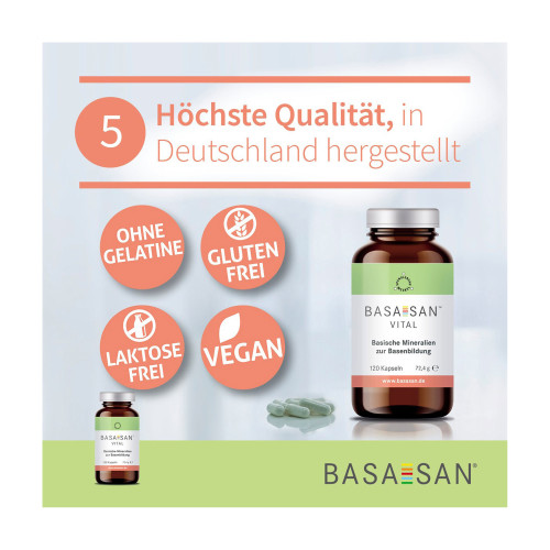 Die in der Apotheke erhältlichen BASASAN® Vital Kapseln stellen die ideale basische Basistherapie dar. Der besondere Inhaltsstoff Calciumcitrat bindet die im Körper vorliegenden Säuren. L-Cystein beschleunigt ihre Ausscheidung. Gleichzeitig werden lebensnotwendige Mineralien wie Calcium, Magnesium oder Zink zugeführt. Abgerundet wird die Zusammensetzung durch Vitamine und andere Mikronährstoffe.