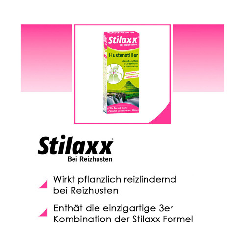 Der Stilaxx® Hustenstiller lindert trockenen Reizhusten. Seine reizlindernde Wirkung erhält der Stilaxx® Hustenstiller aus den natürlichen Pflanzenextrakten von Isländisch Moos, Eibischwurzel und Süßholzwurzel – die einzigartige 3-fach Kombination.